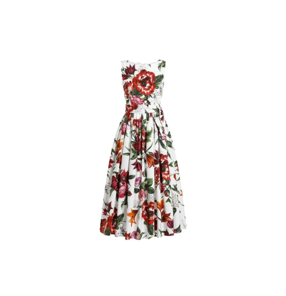 The Red Flower Print Poplin Sleeveless Midi Dress by Dolce & Gabbana is a graceful...