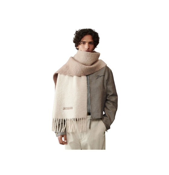 The Beige Moisson Gradient Wool Scarf by Jacquemus takes inspiration from natural textures, featuring a tactile, brushed finish. Made in Italy from pure wool, this rectangular scarf is finished with fringed edges, offering a rustic yet refined cold-weather accessory.
