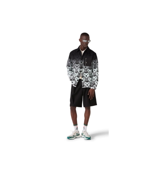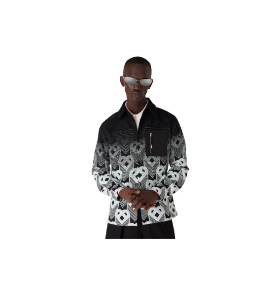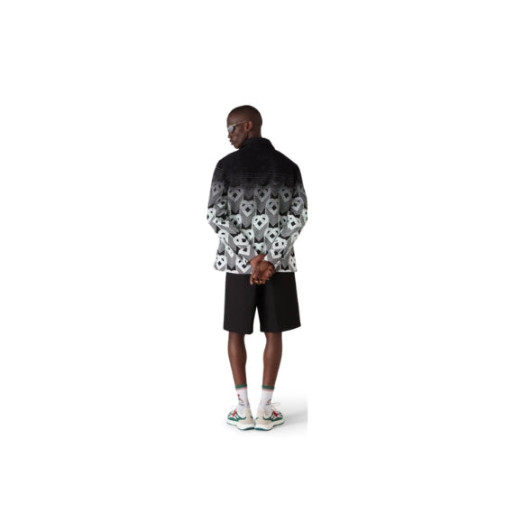 The Black Gradient Monogram Shacket by Casablanca redefines utilitarian attitude with luxe texture and graphic awareness. Made in Portugal from jacquard bouclé fabric, this shacket features a tonal gradient monogram pattern and branded gold-plated buttons for elevated utility.