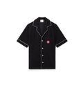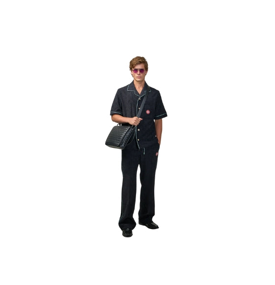 The Black Monogram Jacquard Towelling Shirt by Casablanca elevates resort-style shirting with nods to vintage loungewear elegance. Expertly crafted in Portugal from soft monogram towelling fabric, this shirt features gold-rimmed pearl buttons and expertly piped trims along the collar, placket, cuffs, and chest pocket.