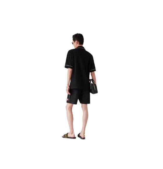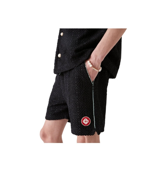 The Black Monogram Towelling Shorts by Casablanca bring refined loungewear to luxurious casual dressing. Woven in Portugal from signature monogram jacquard towelling, these shorts feature gold-tipped drawstring detailing and tailored pintuck seams for elevated off-duty style.