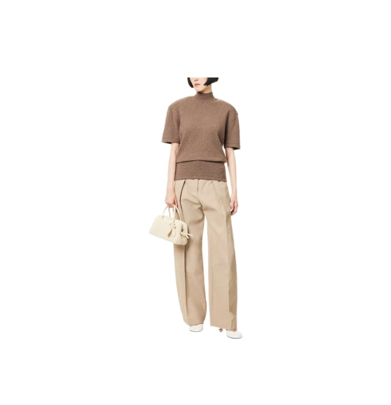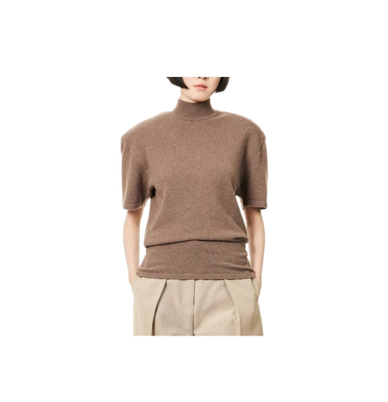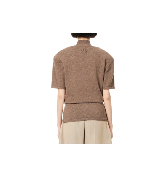 The Brown Mock-Neck Wool Castagna Top by Jacquemus blends refined structure with relaxed comfort. Crafted in Portugal from a heavyweight wool-blend, this top features elegantly padded shoulders and a cropped silhouette—designed for a sleek, architectural fit.
