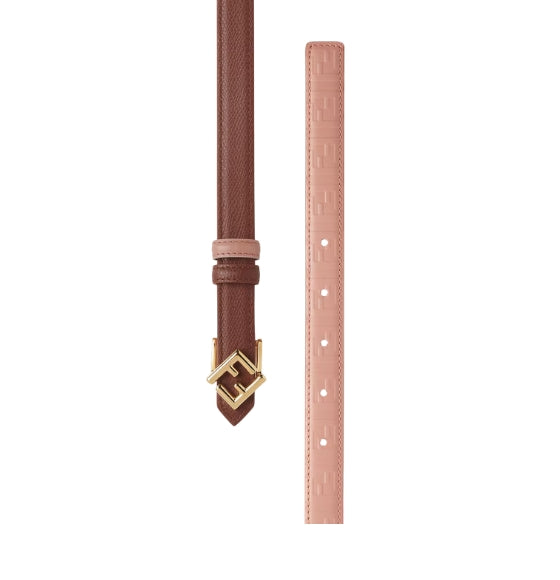 The Brown Pink FF Motif Reversible Leather Belt by Fendi is a sophisticated accessory that offers dual styling versatility with a bold twist. Made in Italy from premium calf leather, this belt features a reversible design—one side in rich brown and the other in soft pink, embossed with the iconic FF motif. A diagonal FF stud buckle in gold-finish metal adds a refined accent, while the slim 2 cm width makes it ideal for cinching dresses or elevating tailored looks. Whether worn for contrast or coordination, it’s a polished nod to Fendi’s heritage.