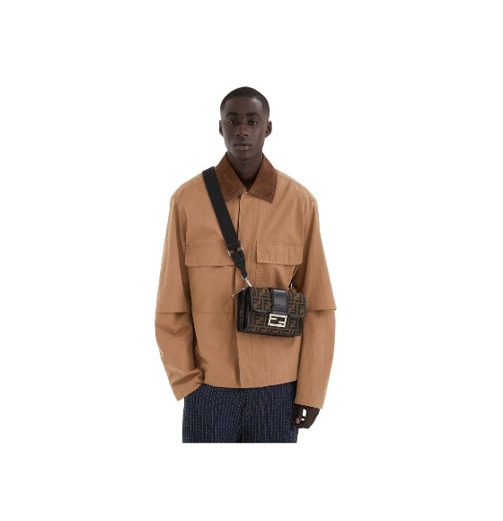 The Dark Brown FF Motif Double Baguette Crossbody Bag by Fendi is a modern reinterpretation of the iconic Baguette silhouette, designed for versatility and bold style. Made in Italy from rich brown FF jacquard fabric, this bag features a dual-compartment structure—one with a square flap and FF magnetic clasp, and the other secured by a zip closure. Between the compartments lies a flat pocket and hooks for the adjustable, detachable, and reversible fabric strap, which showcases FENDI lettering on one side and the Pequin motif on the other. Finished with black leather accents and palladium-finish metalware, it’s a refined companion for both casual and elevated looks.