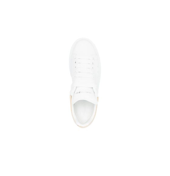 The Gold-Detailed White Oversize Sneakers from Alexander McQueen are a refined take on the brand’s iconic silhouette. Crafted in Italy from smooth white calf leather, these sneakers are elevated by a contrasting metallic gold heel tab and a chunky rubber sole. Their clean lines and exaggerated proportions make them a standout staple for everyday luxury with a bold twist.