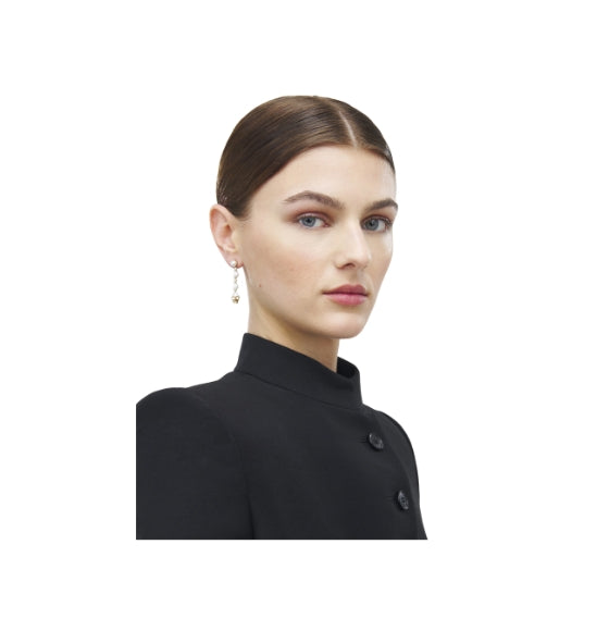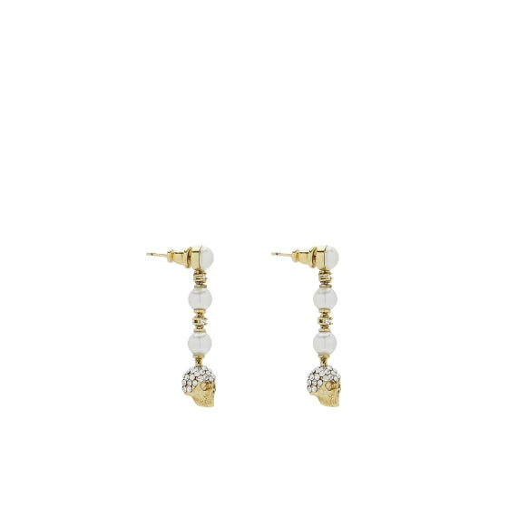 The Gold Long Skull and Pearl Earrings from Alexander McQueen are a striking fusion of gothic elegance and refined femininity. Crafted in Italy, these sculptural drop earrings feature the brand’s signature skull motif paired with luminous faux pearls, suspended from a polished gold-tone setting. Their dramatic silhouette and intricate detailing make them a bold statement piece for evening glamour or elevated daywear.