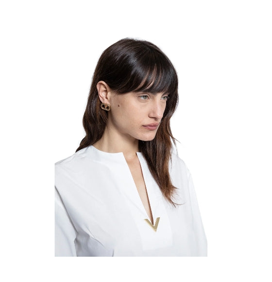 The Gold Ovalette Signature V-Logo Metallic Earrings by Valentino Garavani are a sculptural expression of modern elegance. Made in Italy, these earrings feature a polished oval silhouette crafted from gold-tone metal, centered with the iconic VLogo Signature plaque for a bold yet refined statement. Designed for pierced ears, they fasten with a pin-back closure and offer a luminous finish that elevates both daywear and evening ensembles. Their minimalist form and gleaming surface make them a versatile addition to any curated jewelry collection.