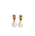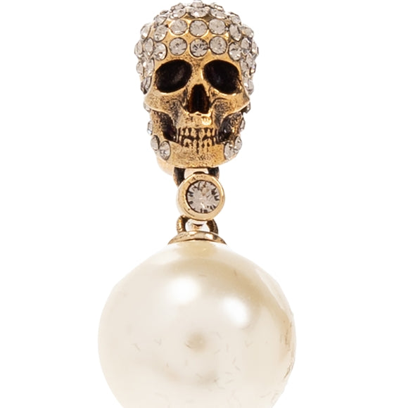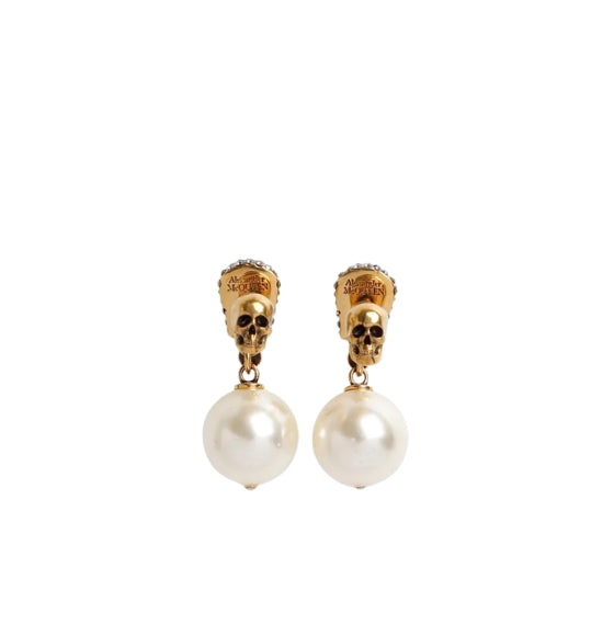 The Gold Short Skull and Pearl Drop Earrings from Alexander McQueen are a refined take on the brand’s signature gothic aesthetic. Crafted in Italy from polished gold-tone brass, these elegant earrings feature the iconic skull motif paired with luminous faux pearls. Their compact drop silhouette makes them a versatile statement for both everyday edge and evening sophistication.
