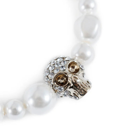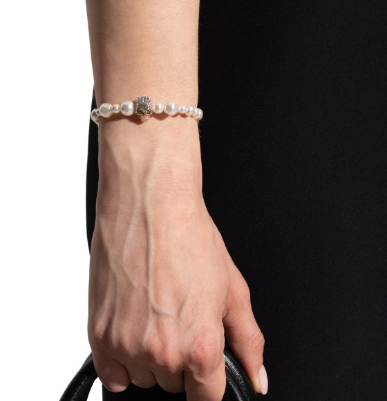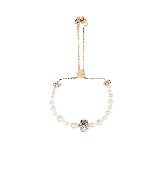 The Gold Skull and Pearl Friendship Bracelet from Alexander McQueen is a sophisticated expression of modern elegance with a signature edge. Expertly crafted in Italy, this delicate bracelet features a polished gold-tone chain adorned with luminous faux pearls and a sculptural skull charm encrusted with shimmering crystals. Its adjustable design ensures a graceful fit, making it a refined statement piece for both day and evening wear.