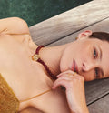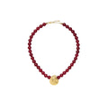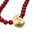 The Gold Spiral Red Gemstone Beaded Pendant Necklace by Missoma is a sculptural celebration of oceanic inspiration and artisanal elegance. Handcrafted from 18ct recycled gold plating on brass, this necklace features a spiral shell-inspired pendant paired with a strand of deep cherry red dyed crystal quartz beads. Each gemstone is naturally irregular, making every piece uniquely beautiful. Suspended from a gold-plated trace chain, the necklace offers a rich contrast of texture and tone‰ÛÓperfect for layering or wearing solo as a statement of refined individuality.