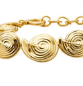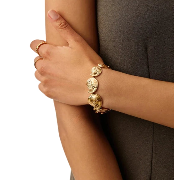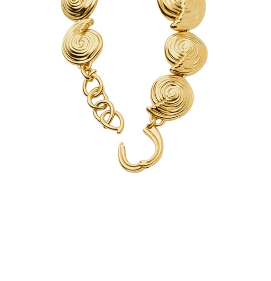 The Gold Spiral Statement Chain Bracelet by Missoma is a bold celebration of sculptural artistry and oceanic inspiration. Handcrafted from 18ct recycled gold plating on brass, this bracelet features a series of linked spiral elements that vary in size, creating a dynamic and fluid silhouette. The bespoke chain extension allows for a customizable fit, while the polished finish adds radiant elegance. Whether worn solo or layered with gemstone or bangle bracelets, it‰۪s a standout piece that brings movement and texture to any wrist stack.