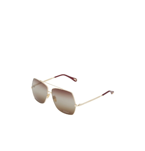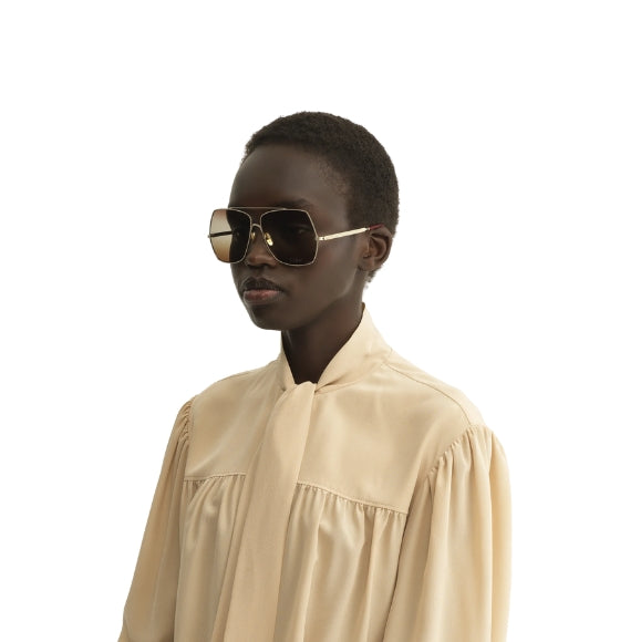 The Gradient Gold Brown Fine Aly Sunglasses by Chloé reinterpret the classic aviator silhouette with a refined, feminine edge. Crafted in Italy, these square-frame sunglasses feature a shiny gold-tone metal frame paired with triple gradient lenses in brown, grey, and khaki. The drop-shaped temple tips are designed to accommodate Chloé's signature eyewear jewelry, while the engraved logo on the temples adds a subtle branded finish. Lightweight and protective, they offer 100% UVA and UVB coverage, perfect for sun-drenched days with a touch of Parisian flair.