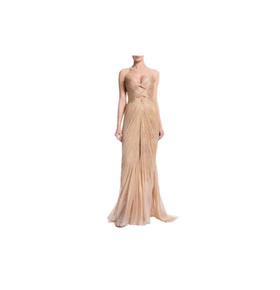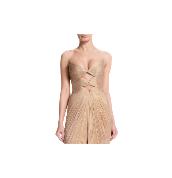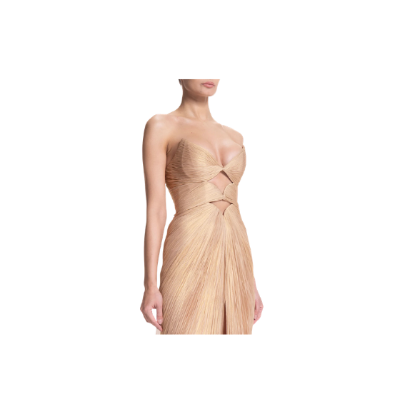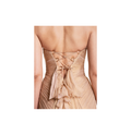 Make a bold statement in the Mischa strapless gown, featuring striking under-bust double cut-outs that create a dramatic and modern silhouette. The flowing train adds ethereal movement with every step, while the lace-up back allows for an adjustable fit, sculpting the figure to perfection. Ideal for formal events, red carpet appearances, or special occasions, this gown combines daring design with sophisticated elegance.