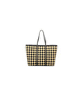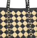 The Valentino Garavani Rockstud Embroidered Shopping Bag in natural and black raffia blends artisan detailing with Valentino’s signature bold aesthetic. Adorned with platinum-finish studs, it features a spacious canvas-lined interior and a removable leather pouch—ideal for polished, everyday luxury with a handcrafted twist.
