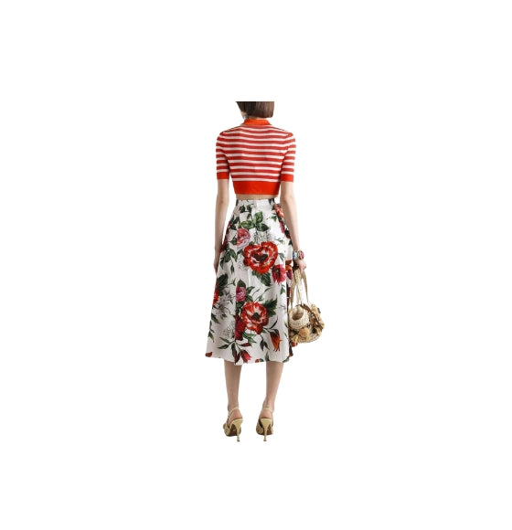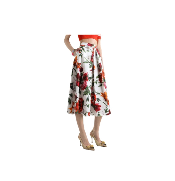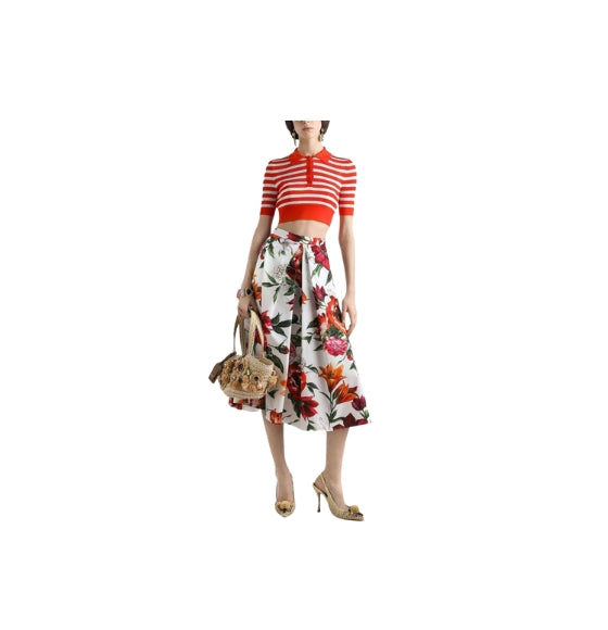The Red Flower Print Poplin Flared Midi Skirt by Dolce & Gabbana is a vibrant celebration of feminine elegance and Mediterranean charm. Made in Italy from crisp cotton poplin, this midi-length skirt features a vivid red floral print on a clean white base. The pleated waist and 3 cm-high waistband create a flattering silhouette, while the covered zip closure at the back ensures a seamless finish. Unlined for lightness, it includes a welt pocket for subtle functionality. Each piece is unique, with print placement varying as part of the brand’s artisanal “Handmade†tradition.