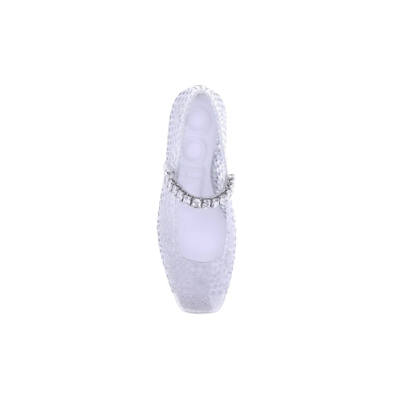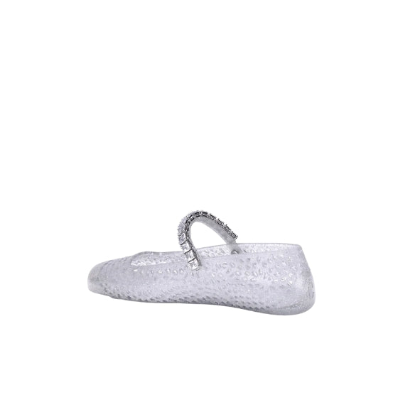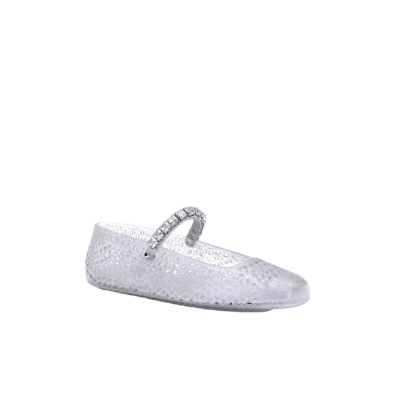 The Silver Crystal-embellished The Jelly Ballerinas by Jimmy Choo reimagine a nostalgic silhouette with a glamorous twist. Crafted from transparent TPU, these flats feature a lace-inspired cut-out design and a modern square toe. The standout detail is the detachable crystal-embellished strap, adding sparkle to every step. A soft foam footbed ensures comfort, while the debossed logo and sculptural lines reflect the brand’s signature elegance. Please note: this style is not water-resistant due to its crystal detailing.
