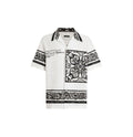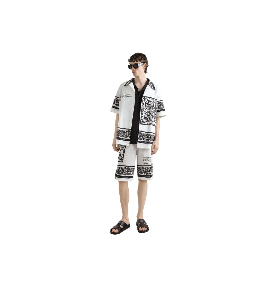 The White & Black Majolica Print Hawaiian Cotton Shirt by Dolce & Gabbana is a sophisticated take on Mediterranean-inspired design, blending traditional Sicilian motifs with a relaxed silhouette. Made in Italy from breathable double piqué cotton, this short-sleeved shirt features the brand’s iconic Majolica print in a striking black and white palette. The Hawaiian-style cut with a camp collar and button front closure offers effortless elegance, while the loose fit ensures comfort and versatility. A celebration of Italian craftsmanship, it’s a standout piece for warm-weather dressing with timeless appeal.