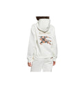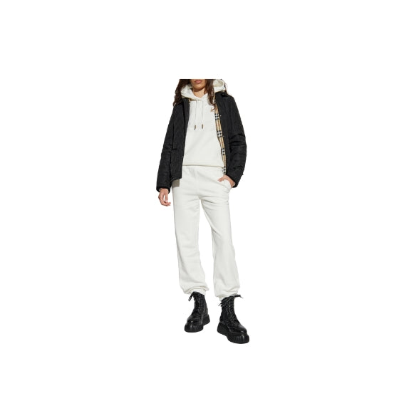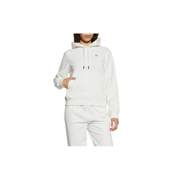 The White EKD Embroidered Checked Hoodie by Burberry brings a luxurious twist to casualwear with its signature equestrian knight design embroidery. Crafted in Portugal from soft cotton jersey, this relaxed-fit hoodie features a drawstring-adjustable hood, kangaroo pocket, and ribbed trims for everyday comfort combined with heritage detailing.