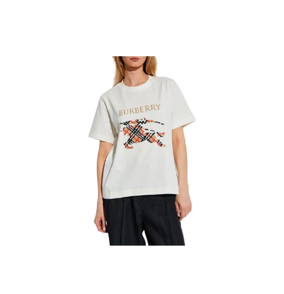 The White Knight Logo Cotton T-Shirt by Burberry is a fresh take on logo tees. Made in Portugal from premium cotton jersey; this style features a subtle yet iconic embroidered Knight Stamp crest on the chest—perfectly blending heritage detail with modern minimalism.